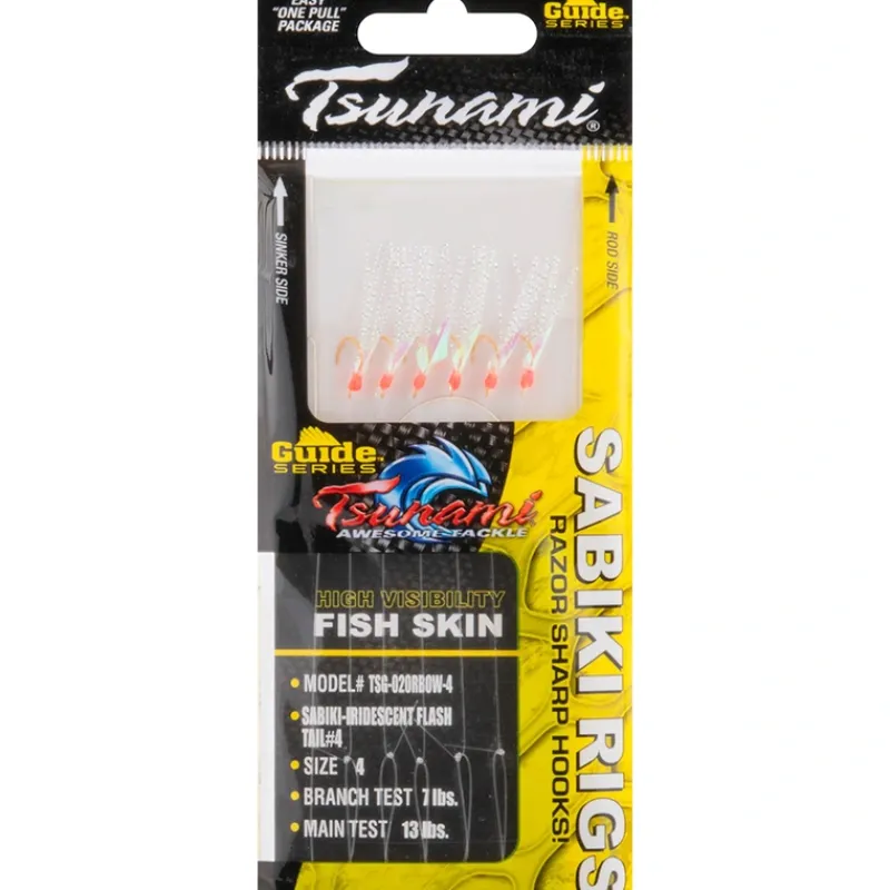 - Tsunami Guide Series Flash Tail Sabiki Rigs are the ultimate tool for catching bait in both inshore and offshore waters! Nothing catches big fish like live bait, and these sabiki rigs are equipped with six razor sharp dressed hooks to catch baitfish like herring, sardines, mackerel, spot, goggle eye, blue runner, and much more. Dressed with extra mylar for an iridescent shine and larger profile, the Flash Tail Rigs are perfect for attracting larger baitfish. Sizes 3 through 6 rigs are tied with a 13lb test monofilament main line and 7lb test branch lines, while size 8 rigs are tied with a 17lb test monofilament main line and 10lb test branch lines. Hook size increases as the rig size value increases (size 3 has the smallest hooks, size 8 has the largest).
