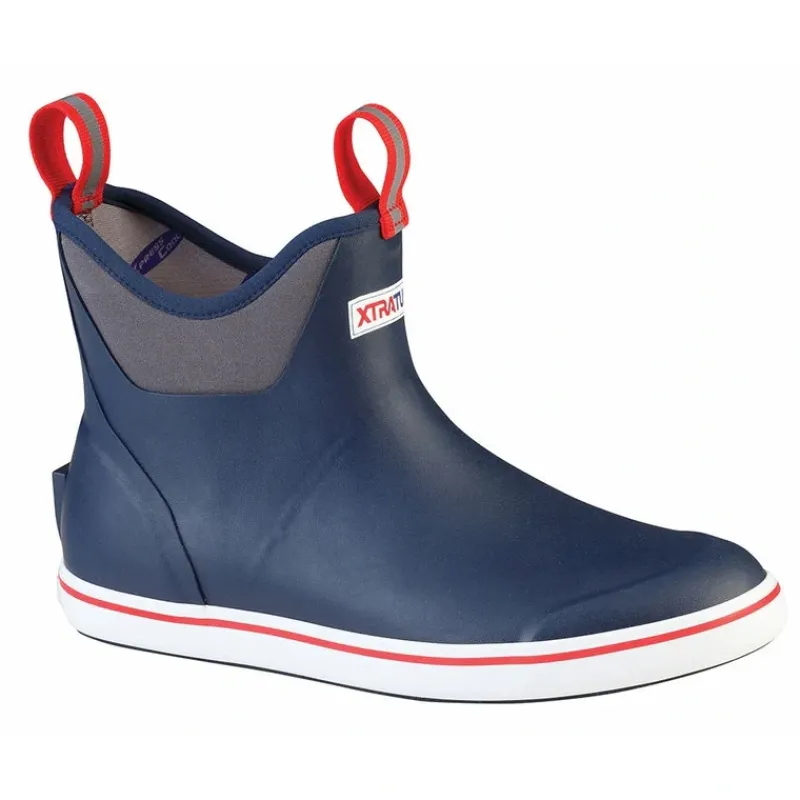 - Any fisherman or boat passenger will have the comfort and protection they need from a pair of Xtratuf ankle deck boots from TackleDirect. Xtratuf has been making premium footwear for the toughest conditions since 1963. These performance deck boots are designed with offshore adventures in mind, combining high-end function with ease of use for the on-water athlete. Avid anglers, tournament pros and casual weekenders alike will be ready for anything in Xtratuf men’s boots. Each 6-inch Xtratuf deck boot is made of 1mm-thick hand-laid neoprene rubber with the same slip-resistant Chevron non-marking outsole used for their flagship Legacy work boots. The 100% waterproof construction also includes an XpressCool liner that wicks away sweat. Ankle-high men’s Xtratuf boots provide stability and protection from most wet conditions while giving you mobility when casting, fighting a monster fish or working the dock. The convenient slip-on style includes front and rear pull tabs to help you get the boot on — and it holds fast no matter how hard you work. These Alaska-ready deck boots also come in nearly two dozen colors so you look great on the water. From simple navy blue and gray boots to woodland camo and mossy bonefish patterns, there’s a boot that fits your personality. Sizes range from men’s 7 to 14 for a wide range of wearers. We have no-hassle returns and exchanges as part of our satisfaction guarantee.