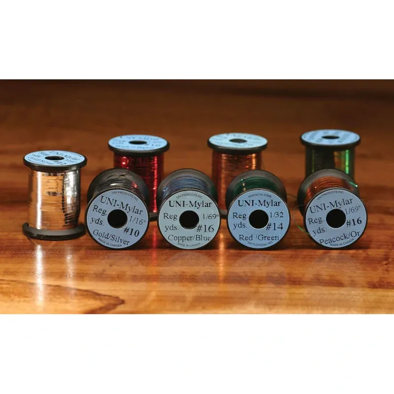 Uni-Mylar is a type of fly tying material known for its reflective properties and versatility. It’s made from a thin, flat strip of Mylar, a polyester film that is coated with a metallic or holographic finish. Uni-Mylar comes in various colors and can be used to add flash and attraction to a wide range of fly patterns.