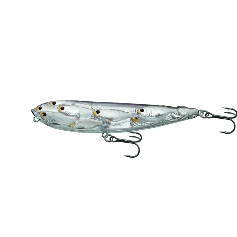 Mimics two small clusters of tiny baitfish on the surface fleeing from gamefish. Best for clear water conditions. Easy “walk-the-dog” and spitting action. Great for schooling topwater conditions. Finesse rattle sound.