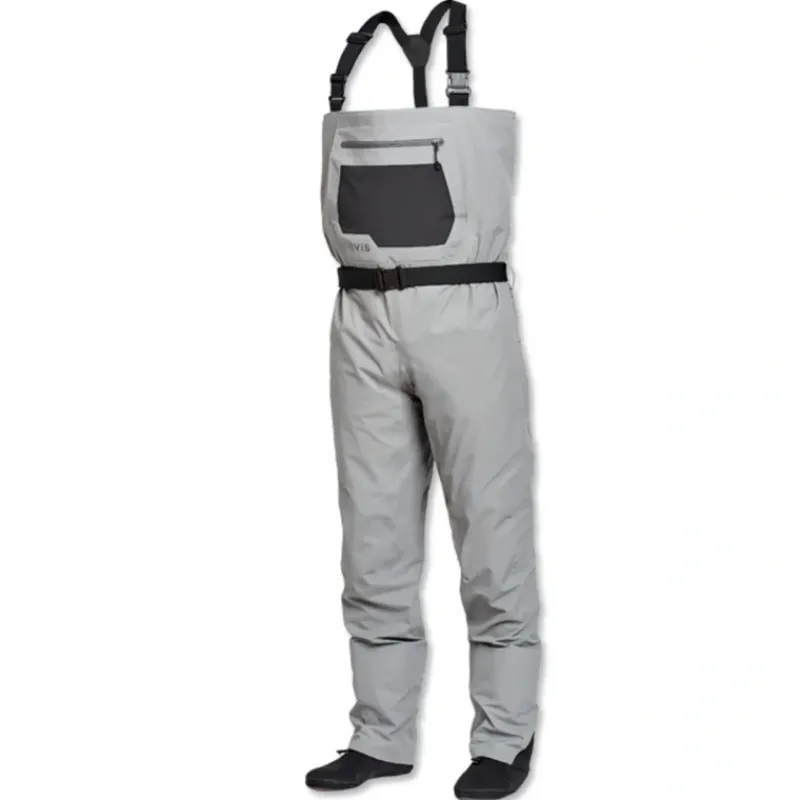 This new Clearwater fly-fishing wader for men is feature rich and built with a modern fit to eliminate traditional bulk. Four-layer waterproof breathable nylon fabric is light yet durable, with a 30K Waterproofness / 8K Breathability rating. Opposing side-release buckles allow for waist-high conversion on warm days. External storage pocket with stretch panel for small items and fly boxes, plus a kangaroo-style handwarmer pocket on the front chest. Updated anatomical neoprene booties with Integrated neoprene gravel guards to reduce water drag and collection. Low-profile seam construction and low-profile belt loops with 1″ webbing belt included. Hook and loop patch on interior pocket to attach Orvis waterproof pocket (8G3H sold separately). In stone. Nylon shell/ polyurethane membrane/Nylon tricot liner. Washable. Imported.