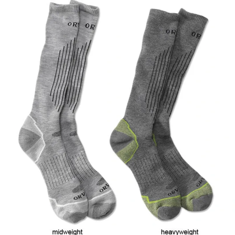 Newly developed and field tested by Orvis fly-fishing and hunting staff, the new Invincible Wader Sock is ready to take you from hearth to field in total comfort. Merino wool, nylon, and just a hint of Spandex unite in a knitted rib construction with padded sole for comfort. Special 1X1 ribbing constructed into the face of the sock eliminates bunching and layering, while strategically-placed nylon at the heel and toe ensures durability. Midweight is 20% lighter than its heavier brother. In light gray (midweight) or dark gray (heavyweight). Midweight: 62% merino wool, 33% nylon, 5% Lycra. Heavyweight: 77% merino wool, 19% nylon, 4% Lycra. One pair per pack. Washable. USA.