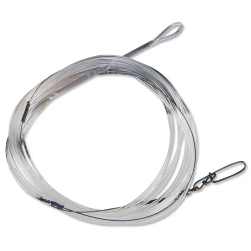 A tough wire leader for mean fish made with an almost indestructible titanium wire bite guard that holds up, fish after fish. In our field tests, as many as 50 fish were landed on a single leader. Complete with swivel to eliminate leader twist, and snap link for quick, easy fly attachment. Fresh- and saltwater. 7′ intermediate leader with 9″ bite guard.