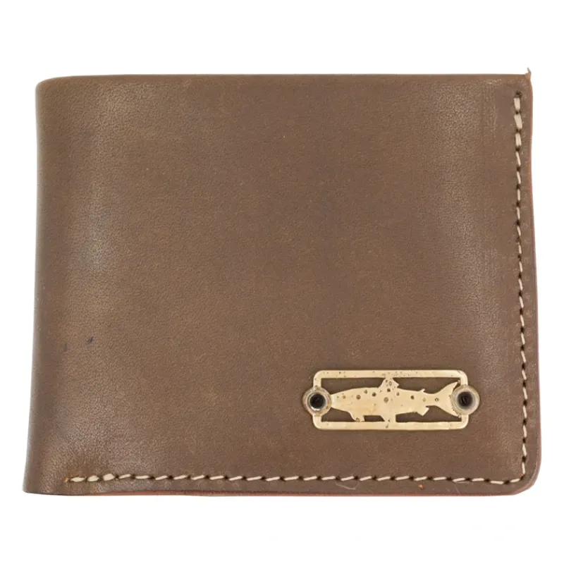 Bronze skinny trout badge riveted on leather wallet with durable nylon thread stitching and our signature blue/green Guatemalan textile interior. Measures 4.5″ length x 3.5″.