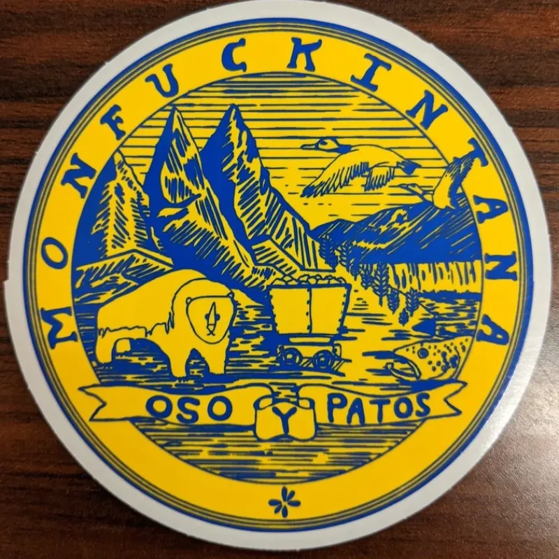 Statriot’s famed Monfuckintana State Seal sticker, Montana printed and ready to be stuck! “Osos y patos.R…
