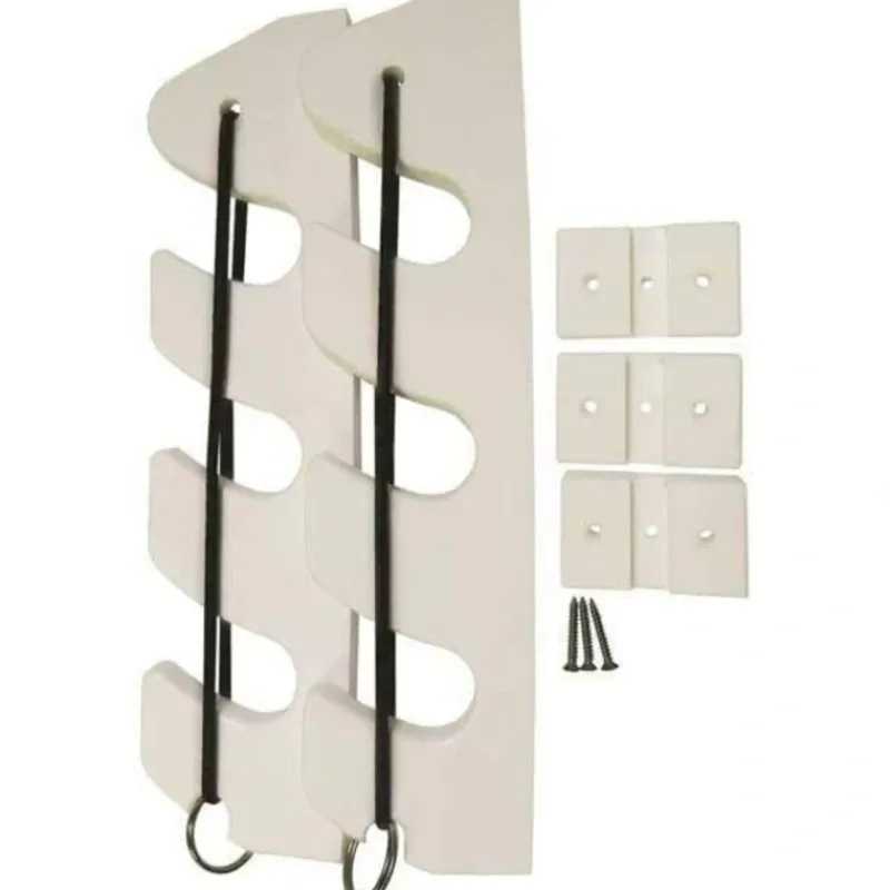 - These racks keep tackle in place even in pounding conditions by the use of shock cords (bungees). “Finger Pull” rings for your convenience. Each set comes complete with 2 units – front and back, 4 mounting plates and stainless screws.
