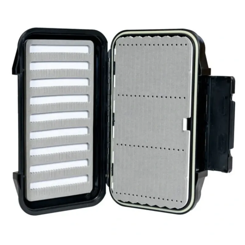 Stores dropper rigs, large streamers, dries, and nymphs in a single water resistant box. our most versatile fly box featuring a unique swing leaf designed to store 7 of your pre-tied dropper rigs. The bottom of the box is extra deep with streamer foam for larger flies while the shallower lid has sawtooth foam for nymphs and smaller flies. This box seals tight with a water resistant gasket and secure easy opening latch. Made from ABS.