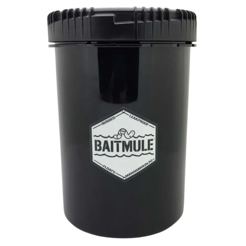 Introducing the Baitmule Storage Container. With Baitmule leaks won’t happen anymore. Upside down or on its side it keeps the liquid where it should be…inside! They are also great for minnows, eels, crabs or keeping your valuables dry. There are 2 sizes. The large white Baitmule holds approximately one gallon and is great for boat fisherman or surf fisherman who fishes from a beach buggy.. The small black Baitmule holds about one quart and is perfect for the surf or boat fisherman, it also fits perfectly inside a plug bag. Baitmules are truly leakproof, unbreakable (within reason), and they also float (large white will float over 8lbs and small black will float over 2 lbs). The large white model also has a place you can attach a lanyard for use on a kayak, or anywhere else it could fall overboard.