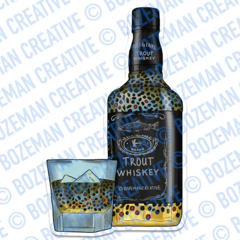 Brown Trout Whiskey Sticker, Trout Whiskey – Fly Fishing Sticker – This is an original illustration by Karl Schwartz of a premium aged bottle of the finest Brown Trout Whiskey. This bottle will certainly help celebrate and awesome day on the water.