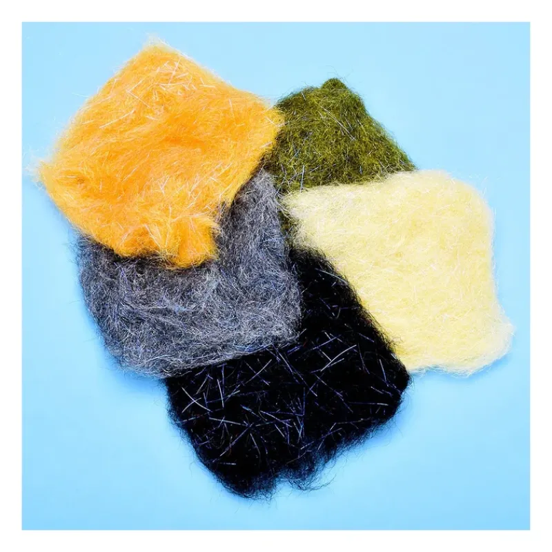 - Fine shreds of synthetic fibers with a hint of flash