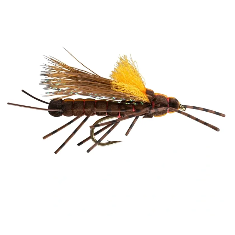 These patterns have highly accurate profiles, great specific density, realistic jointed rubber legs and are darker and more realistically colored than most commercial patterns. Also note the slim head profile on the Salmonfly and the bulkier head profile of the Golden, both of which are key. They also have realistic segmented bodies and high-vis locator patches. Just put it where it needs to be and maybe wiggle it once or twice.