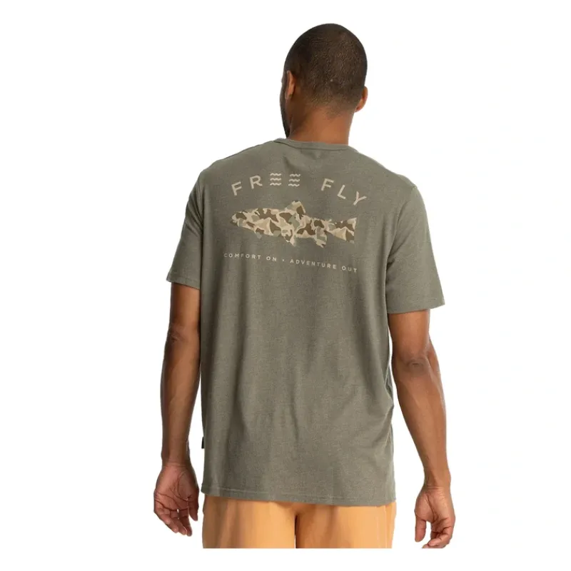 The Trout Camo Pocket Tee has that same soft and worn-in feel of your favorite old tee, outfitted with an original Free Fly design. We created a custom camo print inspired by the shapes of the barrier islands that protect our backcountry, and combined it with our favorite catch from higher altitudes and cooler climates. The left chest pocket has our subtle wordmark and makes a handy place to store your shades.