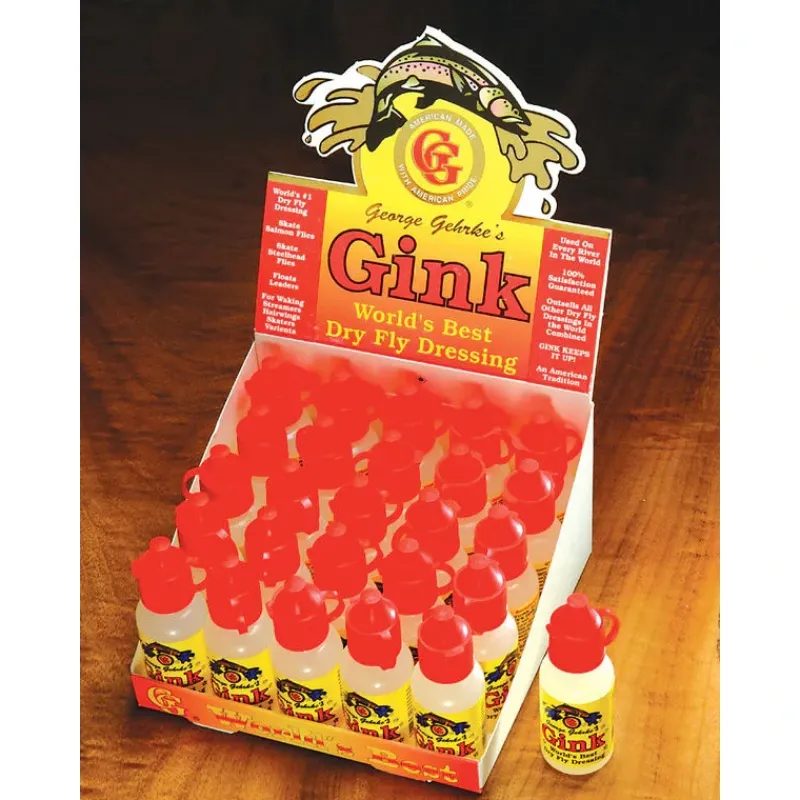 Gehrkes Gink is the first safe, commercially offered dry fly dressing that floated flies repeatedly. It is a liquid emulsifier that permeates deep into the body material of dry flies, and it either coats synthetics or penetrates fur or feather. Upon contact with cold water, it becomes a clear, invisible gel that keeps dry flies or streaking streamers from getting wet.
