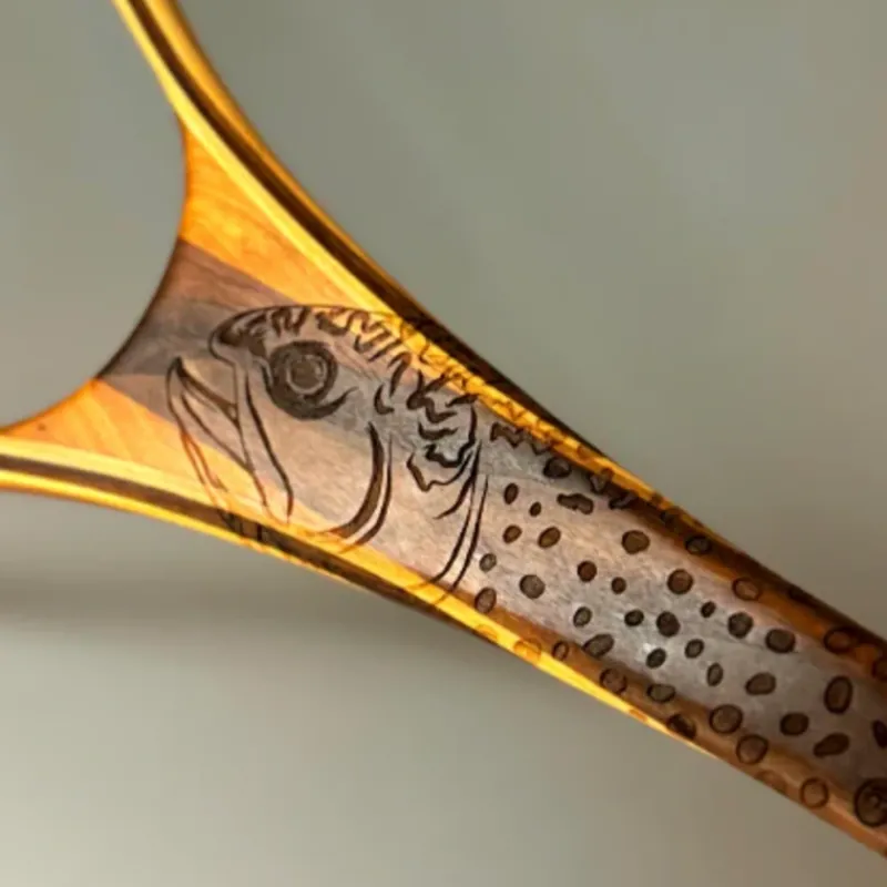 This design was hand-drawn by Tina Lewis and cut directly into the wood handle. We went through 4 or 5 different shapes before we settled on what we find to be a great balance of grip and comfort. Our nets are handcrafted with a teardrop shape so that the end of the hoop is large enough to pull in any catch, while the holes of the fish safe rubber net bags are small to avoid losing a smaller catch.