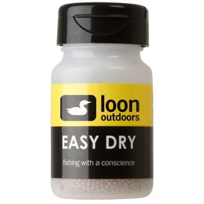 Open flip lid and drop soaked fly attached to leader into container. Hold lid closed without snapping shut, and shake a few times. When blue indicator beads turn pink, replace with a new bottle of Easy Dry.
