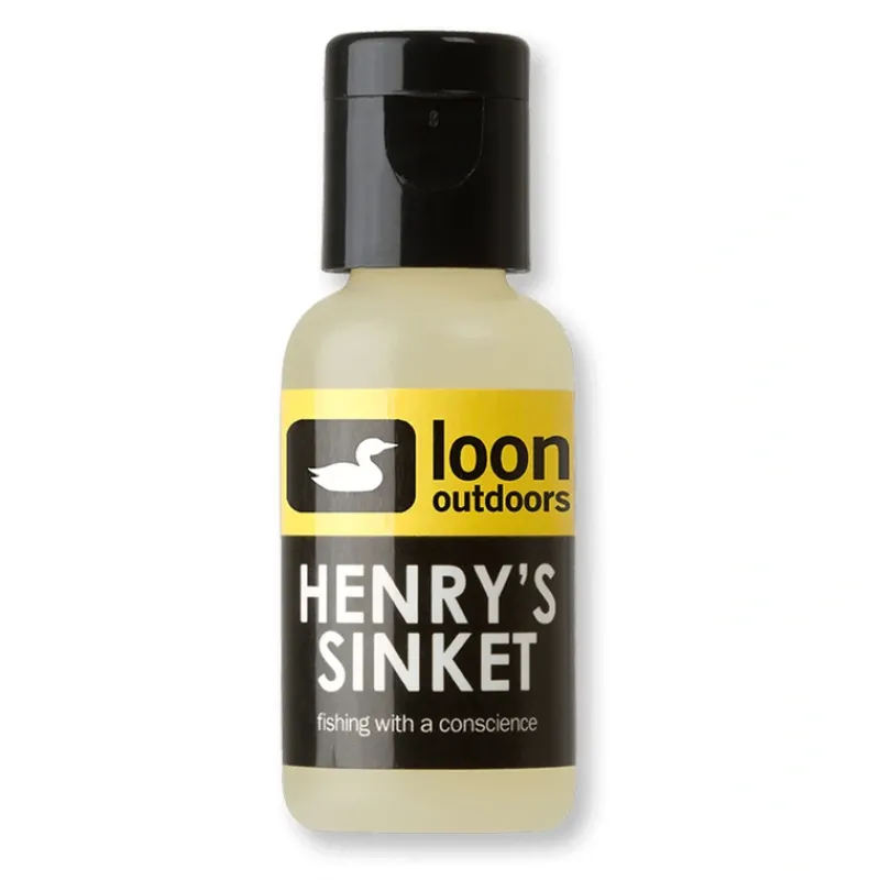 Loon Henry’s Sinket, Flies treated with Henrys Sinket quickly break surface tension and rapidly drop in the water column to where the fish are. It helps nymphs get deep, where they roll along the bottom as naturally dislodged nymphs would. Its especially effective on streamers, getting flies down on the first cast rather than waiting until the materials become saturated. Henrys Sinket is completely biodegradable.Loon Henry’s Sinket.