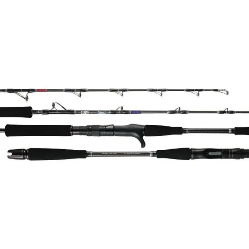 Features extraordinary lifting and fighting power in a slim profile blank, carbon tape cross wrap that increases blank strength and action, genuine Fuji graphite palming reel seat with back stop lock, genuine Fuji alconite “K” frame guides, and tough epoxy coated underwrapped guides.