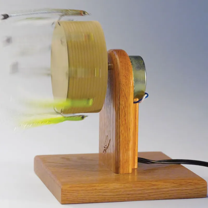 The most effective fly tying tool to evenly cure epoxy on your flies. Five rpm motor turns at the proper speed to cure two-part epoxy resins. Four-inch slotted foam wheel, can be removed from the motor shaft to be loaded with flies and easily placed back on the motor shaft for rotation. Fly tying tool with solid oak base construction. 120V wall plug. No batteries. Made in USA.