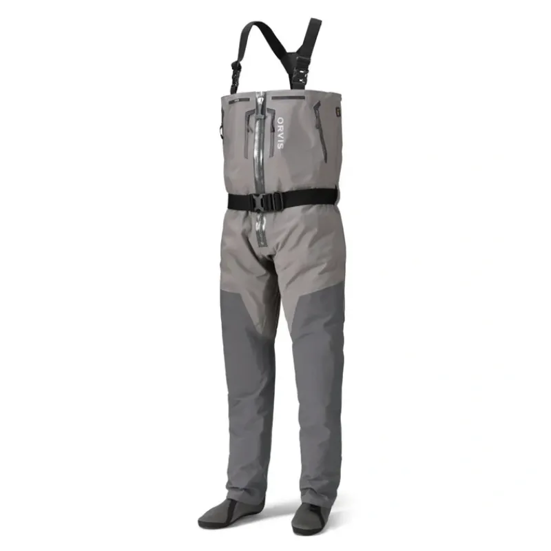 For convenience, comfort, and quick on-and-off, nothing compares to a these zippered PRO fly-fishing waders for men. The convenience of a zipper is obvious, but the wader has to be of the highest quality construction to provide confidence in performance. The PRO Wader is the most durable, abrasion-resistant, and feature-rich wader Orvis has ever built. Constructed with exclusive 100% CORDURA fabric, four layers in the upper and five layers in the lower, the addition of a TIZIP Masterseal waterproof zipper tested for more than 200 days, provides a remarkable level of combined convenience and performance. In the upper are split fleece-lined handwarmer pockets, two external storage pockets with YKK AquaGuard coated zippers, and split Hypalon daisy chain for tool docking. Inside are two internal storage pockets for fly boxes and accessories. Adjustable elastic suspenders with opposing buckles for waist-high conversion. The five-layer lower incorporates removable OrthoLite X25 knee pads, PU cage mesh gravel guards to eliminate drag and water collection, and anatomically correct neoprene booties.