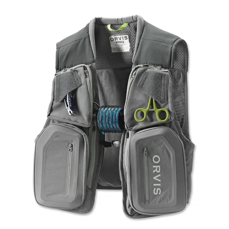 The PRO Vest is designed to carry everything you need, but is very light and breathes well for comfort. It is built of light, abrasion-resistant nylon with a DWR coating. The fitted design is built to conform to the body. The shoulders have a lofted spacer mesh of nylon and spandex. There are 18 pockets10 exterior, 6 interior, and 2 rear ergonomically designed with new materials to provide organization coupled with smooth workflow on the water. The two lower main pockets offer compression-molded construction that add rigidity. The upper pockets are medium size, both with Orvis custom hideaway tool port underneath two fly-drying patches. The rear pockets offer a large pass-through game-style pocket under a full-zip rear pocket with mesh panel divider. Other features include multiple daisy chain gear loops, elastic loops to attach tippet bars, an adjustable closure that slides vertically for a custom fit, padded collar for comfort, internal webbing hanging loop, and a tri-ring net holder centered on the rear yoke. Shell: nylon. Collar and lower pocket: nylon/spandex. Upper interior mesh: polyester. Lower interior mesh: nylon/spandex. Molded pocket base: compression-molded EVA. Washable. Imported.Shell: nylon. Collar and lower pocket: nylon/spandex. Upper interior mesh: polyester. Lower interior mesh: nylon/spandex. Molded pocket base: compression-molded EVA. Washable. Imported.