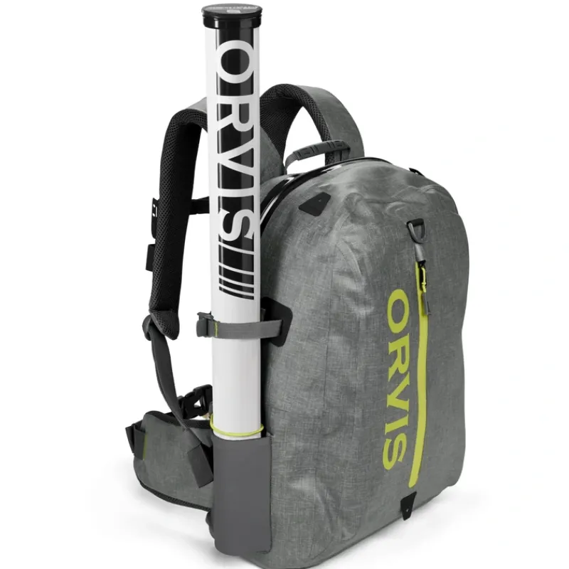 Updated and improved waterproof backpack with a great new look and updated features. Take everything you need for the day knowing no matter what the conditions your gear is safe and dry. The TPU coated 500D nylon protects from heavy rain and even an unintentional swim in the river. Main compartment features a waterproof YKK Flexseal zipper, rated from .05 to 0.4 bar of water pressure. Secondary pocket has water-resistant Ries zipper. Contoured, padded shoulder straps adjust for perfect fit. Adjustable sternum strap for secure fit. Water-resistant padded back panel with ventilation channels for cool comfort when wearing all day and fishing while wearing the pack. Padded bottom protects cameras and other vulnerable gear. Gear station on shoulder strap for use when fishing while wearing the pack. Two water bottle/rod tube pockets. D-ring on back to hold landing net. In gray.