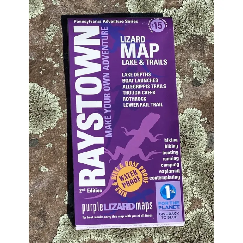 Lizard Maps are durable, waterproof, and give you the big picture the map opens to 24 x 36 and folds easily to 4 x 8 to fit in your back pocket. The Raystown Lizard Map covers all of Raystown Lake on one side, the scale is 1:45,135 (1 inch = 0.7 mile). A detailed map of the Allegrippis Trail System and Trough Creek State Park is on the other side, the scale is 1:22,588 (1 inch = 0.4 mile). Includes both lat./lon. and UTM coordinate systems.