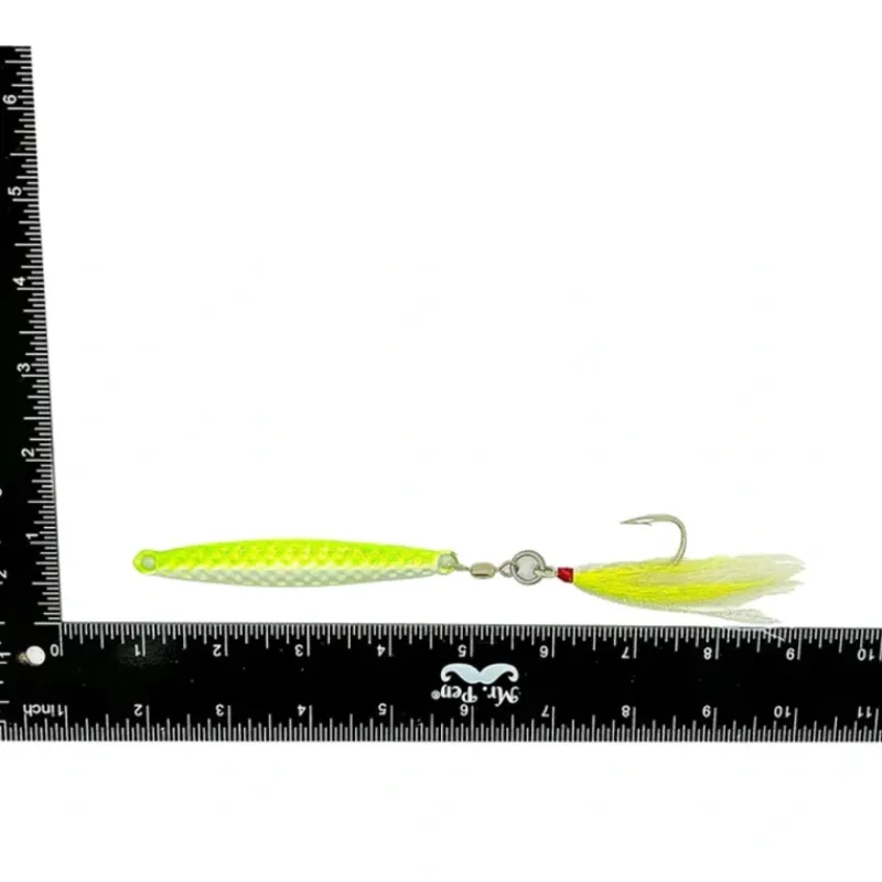 Two toned painted hammer diamond jig. Matching bucktail with hook.