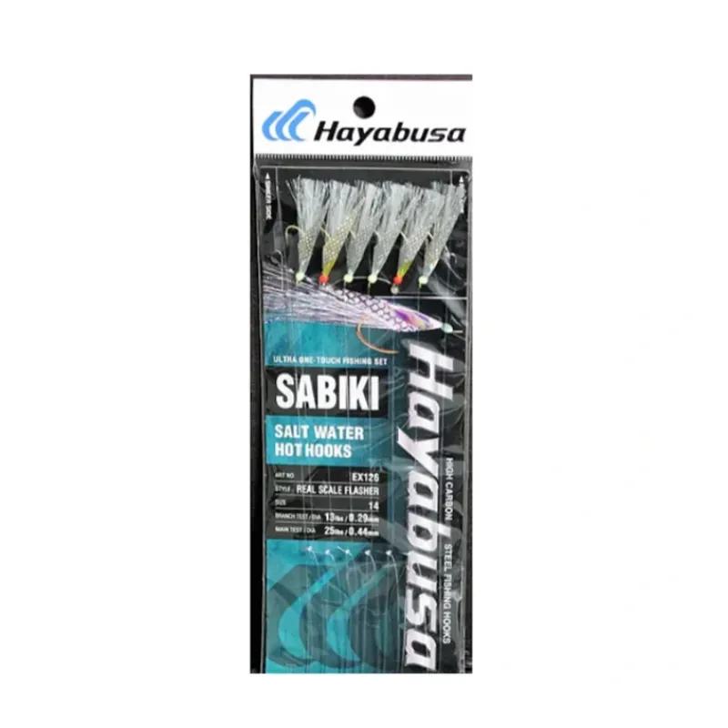 - Hayabusa EX126 UV Series Real Scale Flasher 6-hook Sabiki. Main Line: Monofilament. Branch Line: Fluorocarbon. Size Available: 14. Works great for catching livebait such as mackerel.