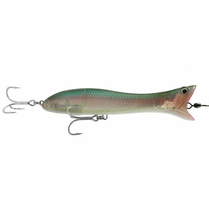 Superb long casting popper, with an extreme good Popping effect! The wide open Mouth, has a great hold in the water and really pops and splashes incredible. The lure also have a great track on regular retrieve, leaving a superb bubble trail and wake bow on the surface. The rear Y-treble hook folds up along the back on the cast and gives a very stable flight. Super Hard ABS Body, with thru going wire, extra strong split rings and Big fish trebles. Great lures for big brutal Saltwater predator fish!