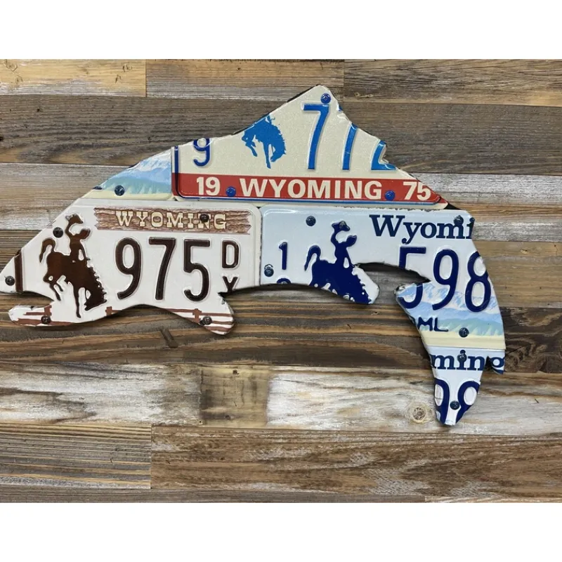 Every size of a fish is a winner! By popular request is our 24″ Wyoming Trout. Every license plate art piece is handmade and unique. Yours will look very similar but will not be exactly the same as the photo example with a mix of nostalgic Wyoming plates.