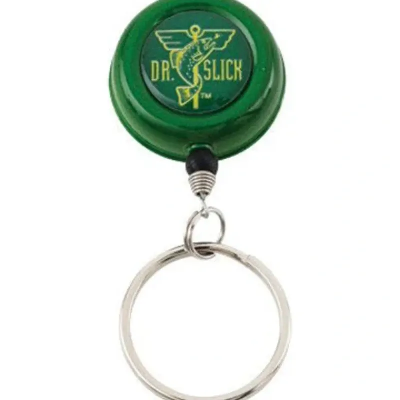 Dr. Slick Pin-On-Reel, Green, Steel Cord, “8” Ring, Dr. Slick pin-on reel features a tough steel cord with a 20-inch draw and a heavy duty pin. Best suited for light accessories like nippers, files, and floatant.