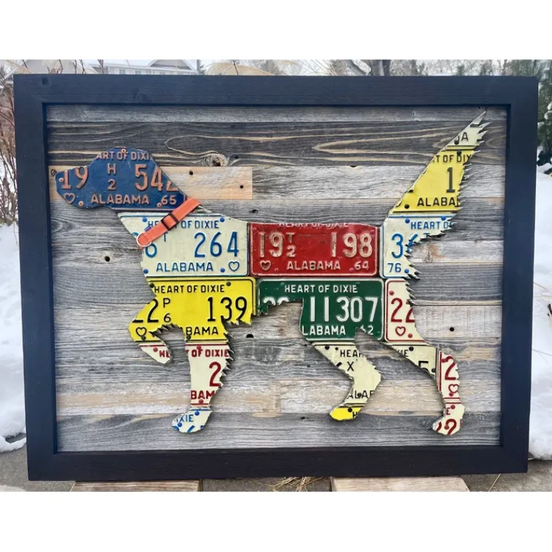With Frame Add-on– While my pieces look amazing hung without a frame, I feel that mounting the artwork on Barnwood really adds definition and depth, and perfectly compliments aged license plates. Should you choose to have your piece framed, please specify whether you would like Espresso-stained or natural Barnwood as the background in the Special Notes and Requests textbox prior to adding it to your cart.