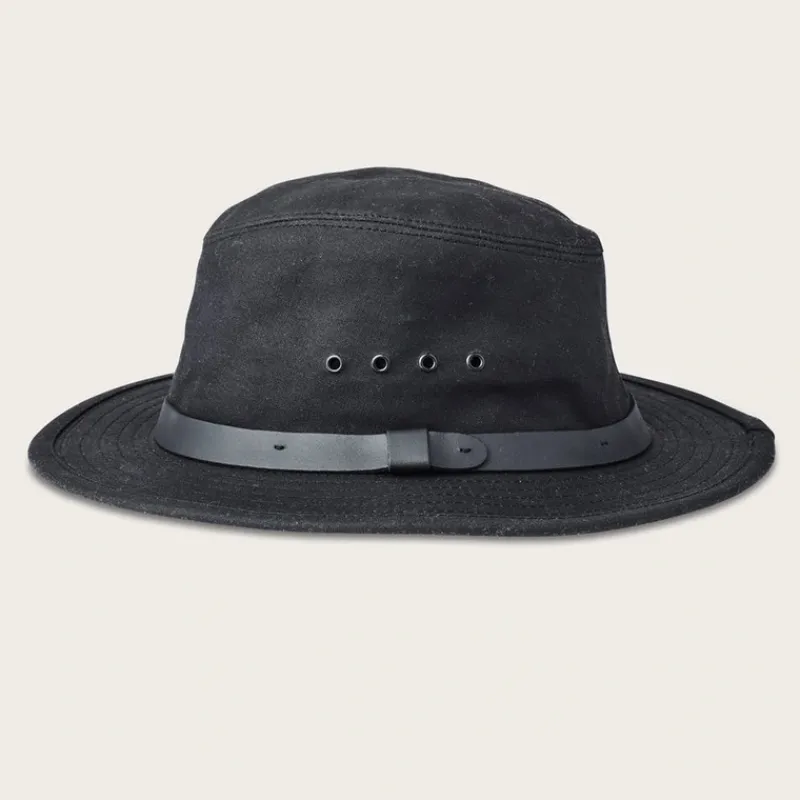 Keep your head dry and your eyes on the water with the Filson Shelter Cloth Packer Hat.Made from durable midweight Shelter Cloth. Water repellent oil finish treatment and outer leather hatband. Inner cotton sweatband. 8 grommets for ventilation.