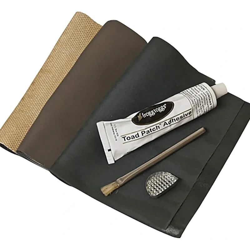 Frogg Toggs Ultimate Waterproof Repair Kit is a universal repair kit for all types of rain gear, waterproof outerwear, waders and boots. The repair kit includes easy-to-follow instructions, adhesive tube, applicator brush, material cloth scrubber and three patches: wader/boot patch, breathable Frogg Toggs patch, and Frogg Toggs Smokin’ Toad heat shield patch for Road Toad suits.