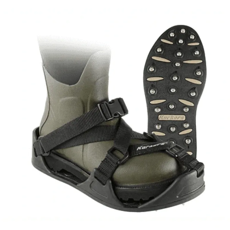 Korkers RockTrax Plus Overshoe, A versatile cleated overshoe product that provides sure-footed traction on mossy rock, ice, and slick terrain. Traction: 52 spikes per pair placed under toe, heel and ball of foot Easy On/Off: Quick release buckle & strap system get you in and out of your cleats quickly Secure Fit: Molded rubber.