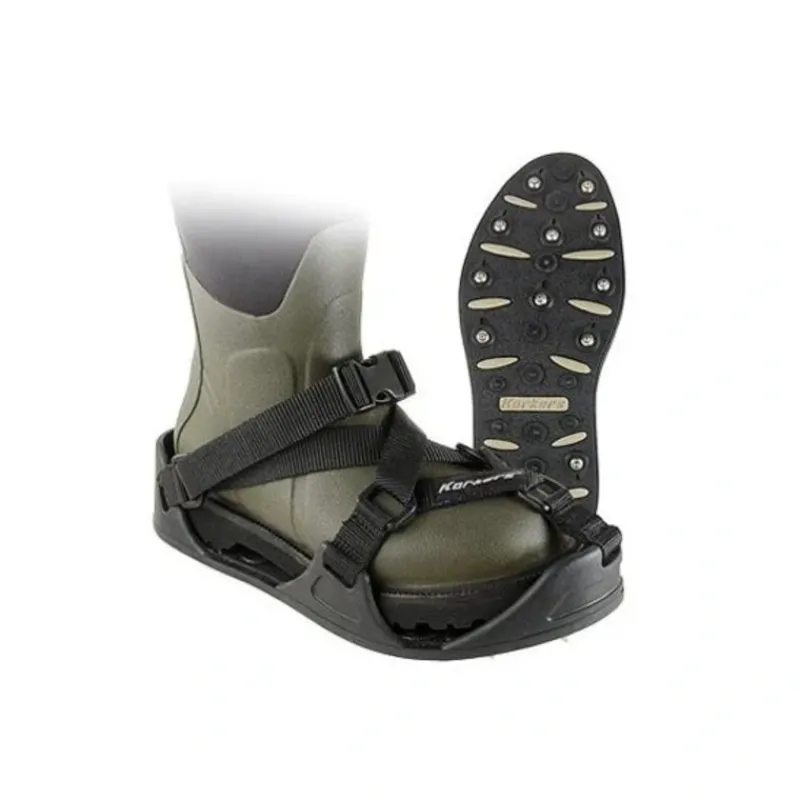 A versatile cleated overshoe product that provides sure-footed traction on mossy rock, ice, and slick terrain.