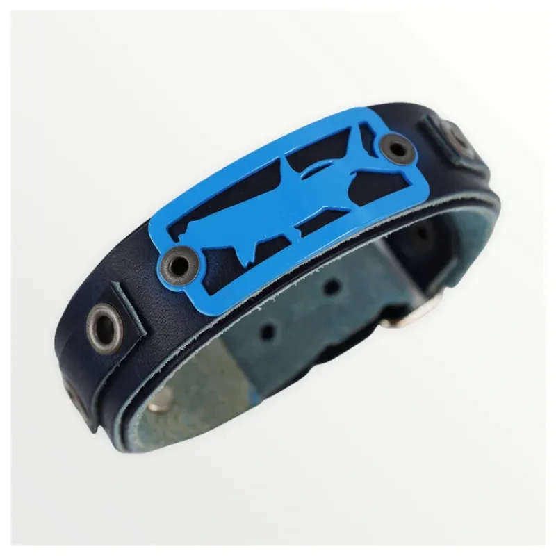 Blue powder coat stainless steel badge mounted on .80 ink blue leather bracelet. Accented with leather and rivets on both sides of the badge. Fastened with just right adjustable sizing closure to size down to 6″ or up to 8″ wrist. Extenders available for larger wrist sizes.