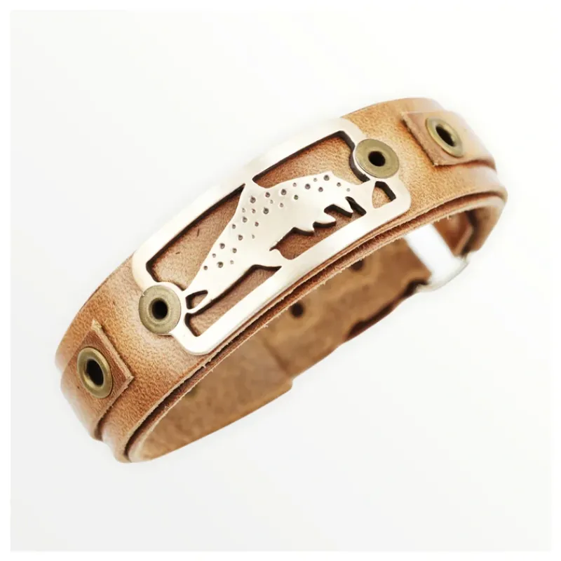 Bronze castbadge mounted on leather bracelet.Accented with leather and rivets on both sides of the badge. Fastened with just right adjustable sizing closure to size down to 6″ or up to 8″ wrist. Extenders available for larger wrist sizes.