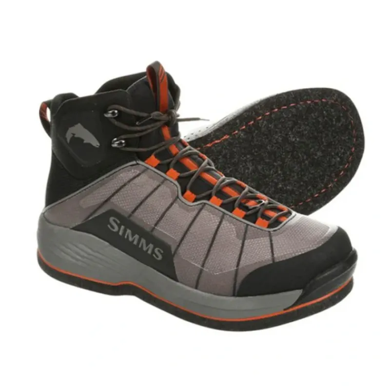 Adventure to the less-traveled high country with Simms weight-shedding, pathbreaking Flyweight Boot. Weighing in at a spry 40 ounces, the boots low-profile design and breathable, abrasion resistant mesh uppers turn long miles and technical terrain into a cakewalk. And when you step into that brilliant, untrammeled water, Flyweights maintain full wading-boot stability and functionality, with reinforced felt soles for stud and cleat retention.
