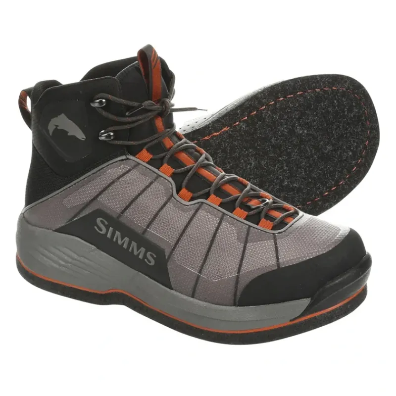 Adventure to the less-traveled high country with the weight-shedding, pathbreaking Simms FLYWEIGHT Wading Boots – Felt. Weighing in at a spry 42 oz., the boot’s low-profile design and breathable, abrasion-resistant mesh uppers turn long miles and technical terrain into a cakewalk. And when you step into that brilliant, untrammeled water, Flyweight Wading Boots maintain full wading-boot stability and functionality, with reinforced felt soles for stud and cleat retention.