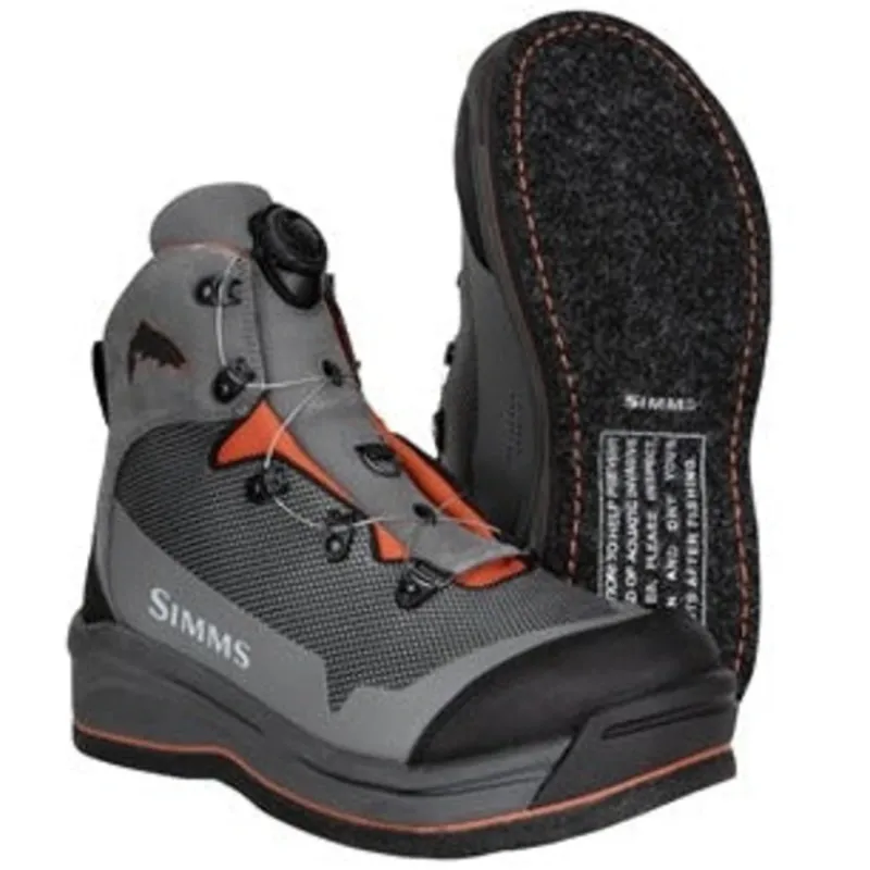 The Simms Guide Boa Felt Sole Fly-Fishing Boot features a Boa closure system for a precise,fast on and off performance with a beefed up wire that is more pliable,on-demand fit that is extremely comfortableand is constructed with a textile mesh overlayed with a full TPU coated upper for durability as well as rubber toe and heel overlays for added protection.Full closed-cell neoprene foam lining inside the Guide Boa boot and pull-on loops for easy on and off are very nice features of this new Simms boot.