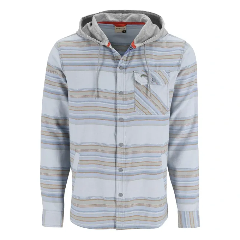 Crafted from a planet-conscious blend of organic cotton and recycled polyester, welcome to the Santee Flannel Hoody a lightweight woven flannel, with the warmth of a knit hood and traditional snap-front fit for wearing on and off the water.