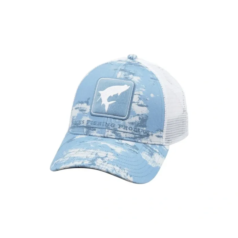 Simms Small Fit Tarpon Icon Trucker Blue Cloud Camo, Stay tuned in to your line in our Small Fit Tarpon Icon Trucker hat. It features a cotton build and a low-crown fit.