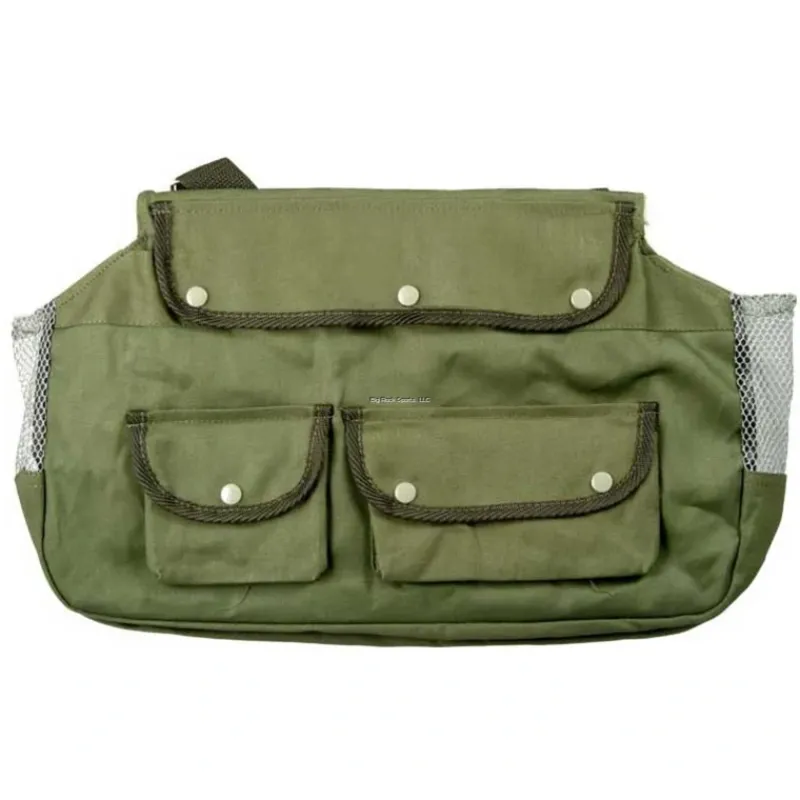 A creel designed for trophy fish. Features include rubber vulcanized liner, nylon mesh side vents, three storage pockets with snap flaps, self-closing spring loaded top and adjustable shoulder strap.