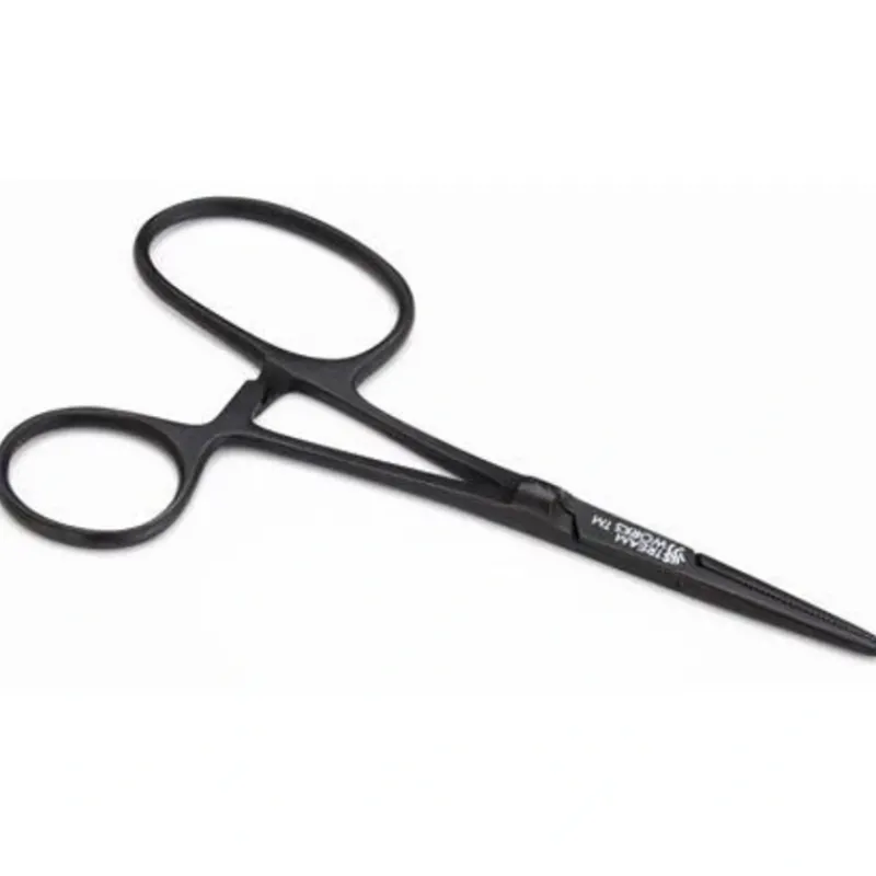A simple but great idea! No more fumbling trying to get fingers in small holes while struggling with a fish, especially while wearing gloves. These 6″ Power Jaw straight forceps have an oversized finger hole and a very handy built-in eye cleaning needle. Available in black or platinum color, please specify.
